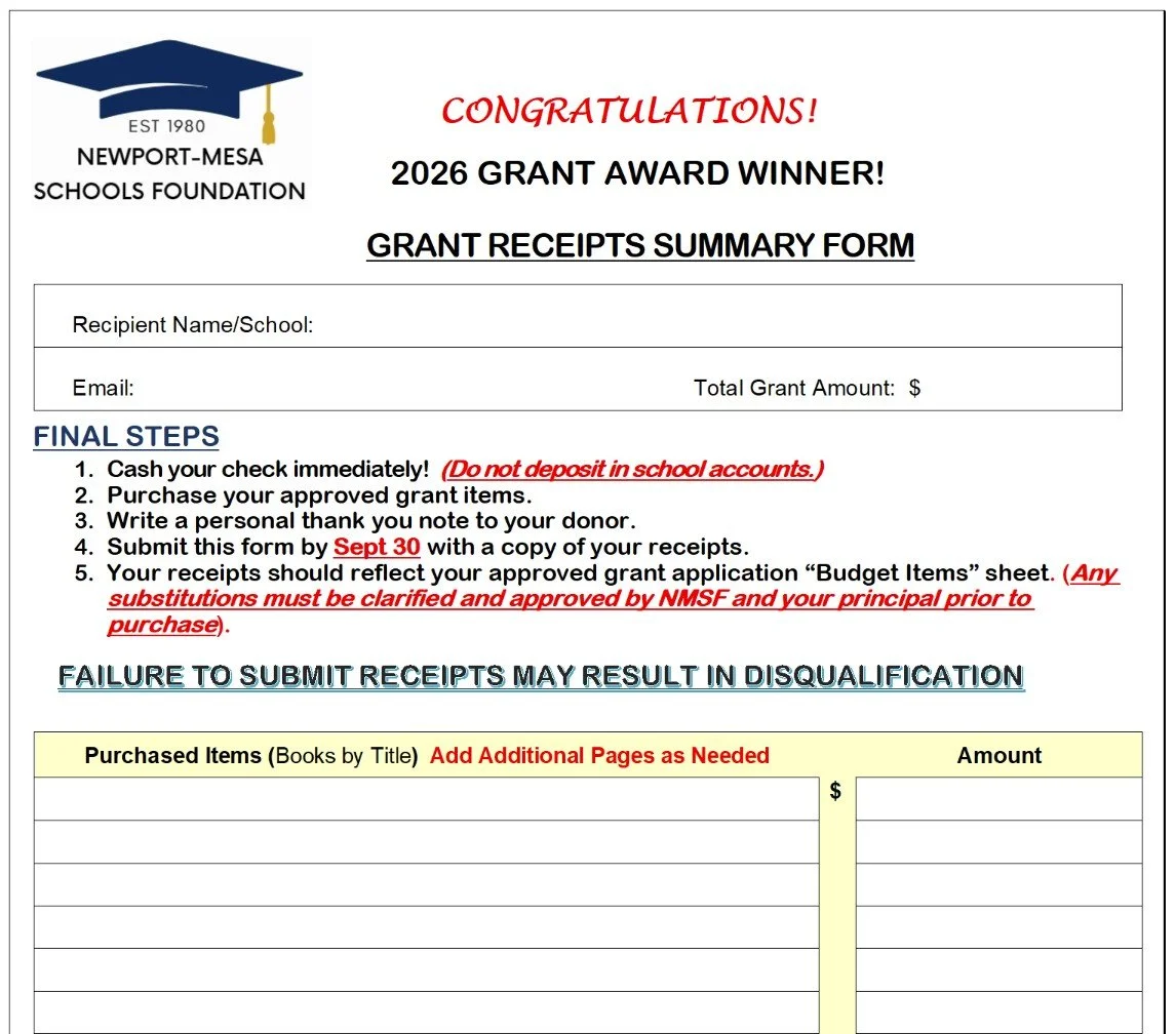 When you are funded for a grant, you are required to return a completed Grant Receipts Summary Form along with all the original receipts from your purchases.