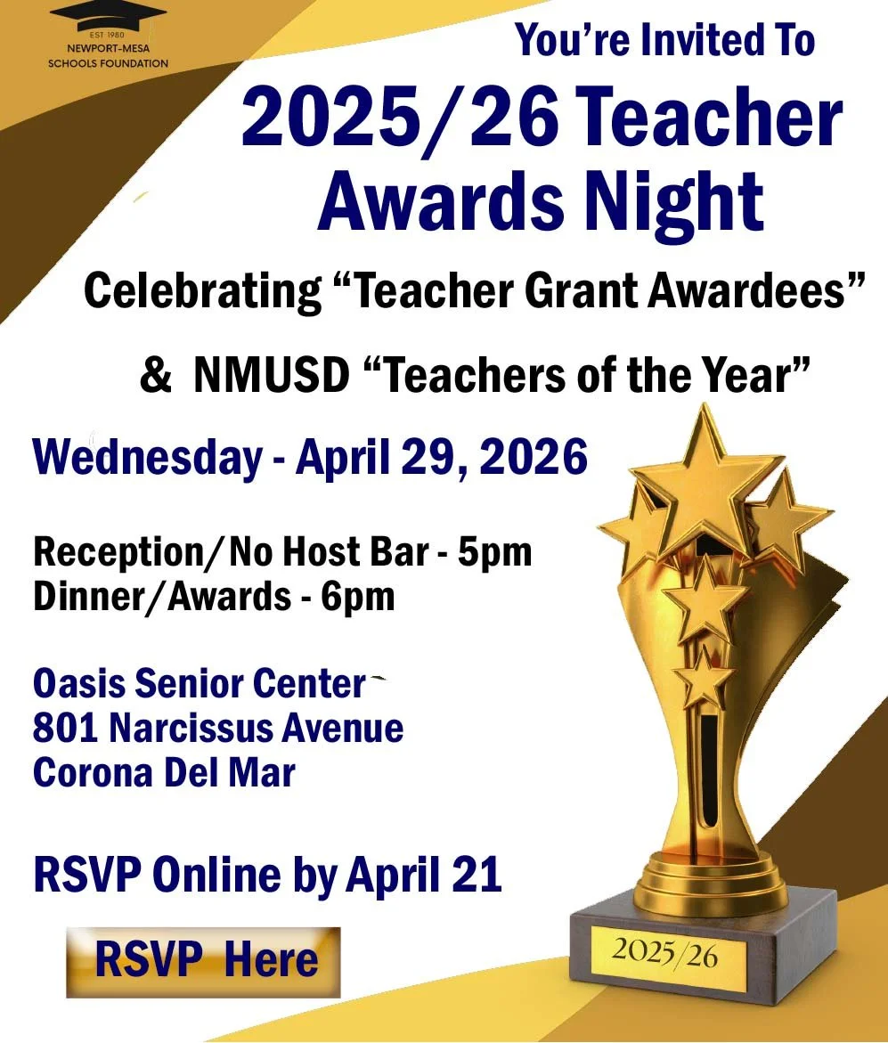 The celebration of our teachers culminates at our annual Teacher Awards Banquet, where we proudly present grant awards and checks to our deserving educators. During this special evening, we also join with the Newport Mesa Unified School District in honoring and announcing the district’s “Teachers of the Year.” This is a great opportunity for our donors and sponsors to have an opportunity to meet their recipients and personally present their grants.